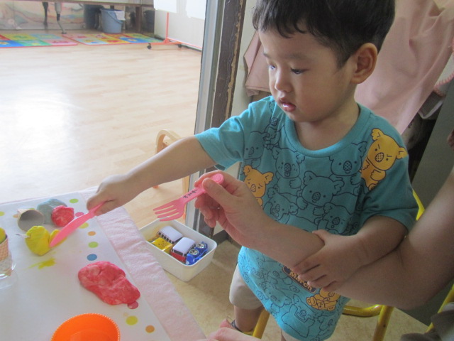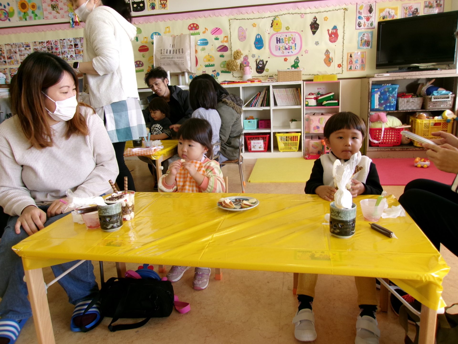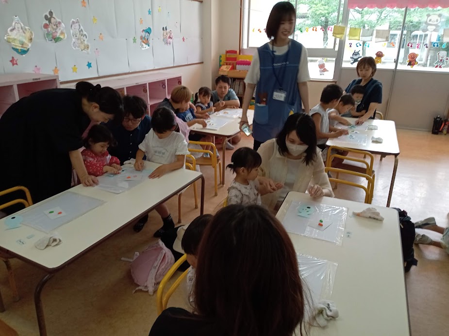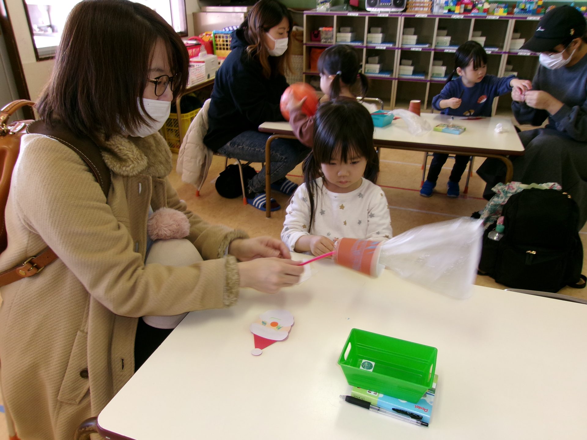 手遊びやクリスマスの絵本の読み聞かせがあり、その後、紙コップでサンタクロースのおもちゃを作りました。